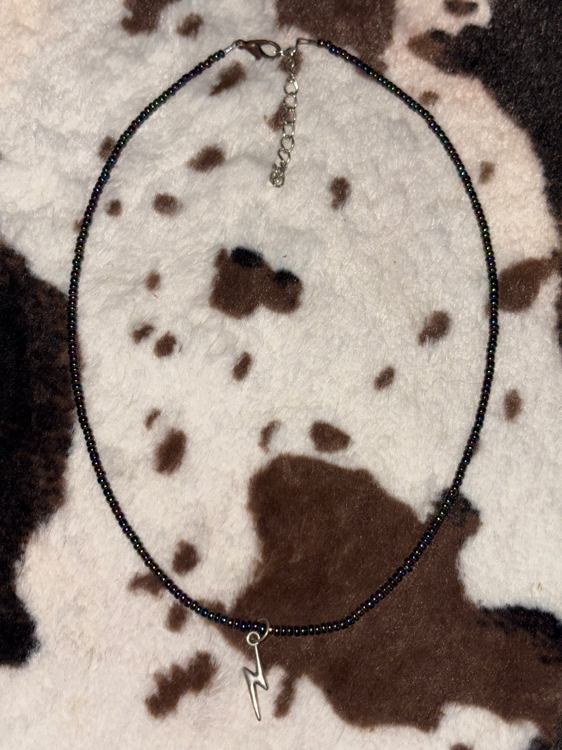 15" Necklace with an extender chain. Featuring a lightning bolt charm on a dark iridescent purple/green seed bead strand.