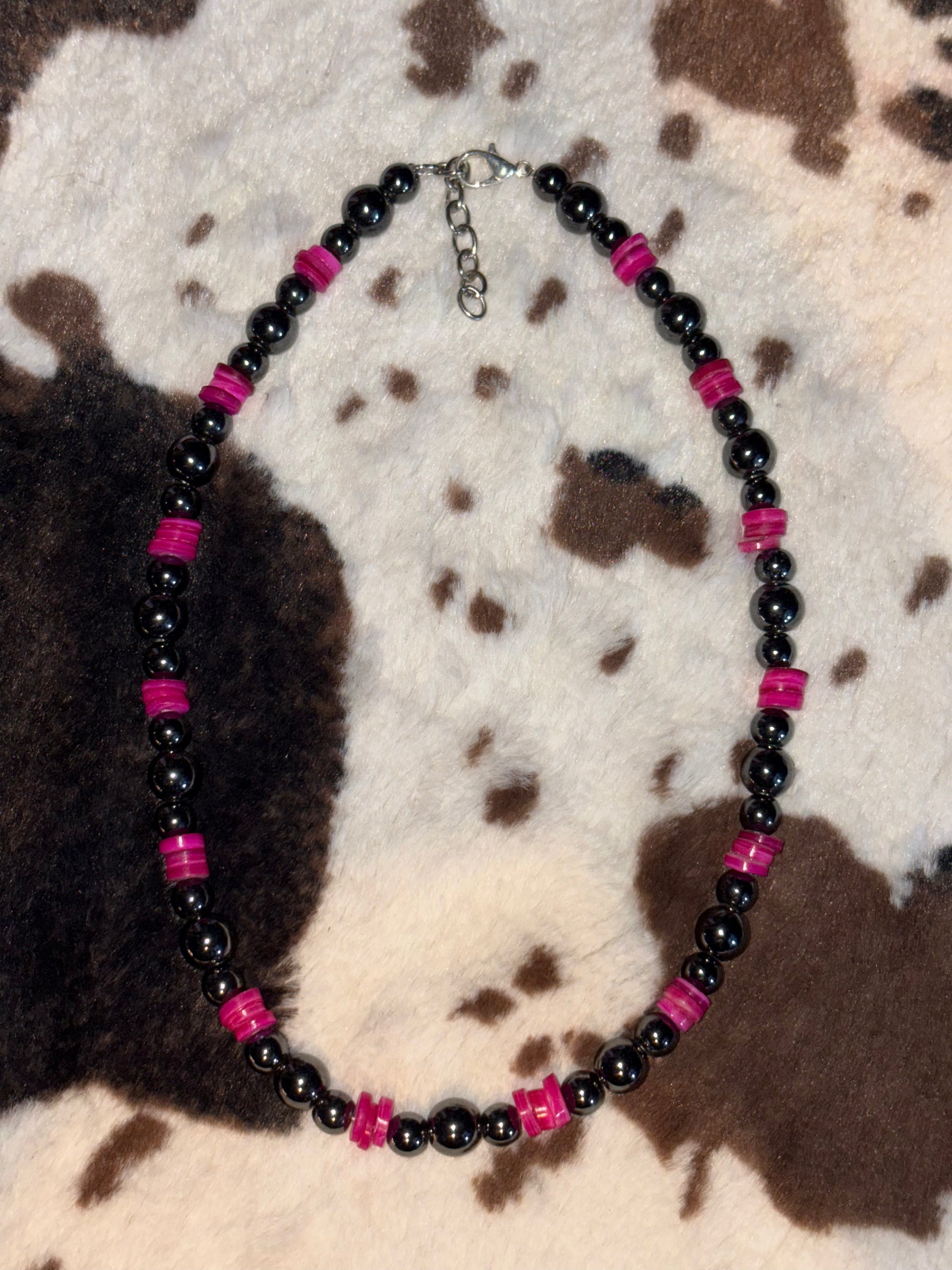 Faux dark grey pearls that give a navajo vibe with pink shell bead accents. 15" with an extender. 6mm and 8mm size pearls.